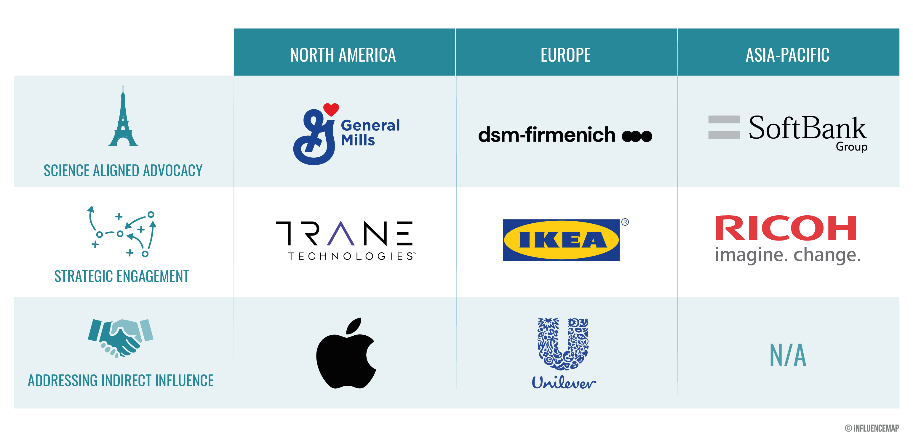 This year’s Global Leaders report from InfluenceMap offers three broad categories in which a company may achieve leadership status: Science-Aligned Advocacy, Strategic Engagement, and Addressing Indirect Influence. Companies highlighted as leaders in these categories have likely instituted many of the steps outlined in the frameworks listed above.