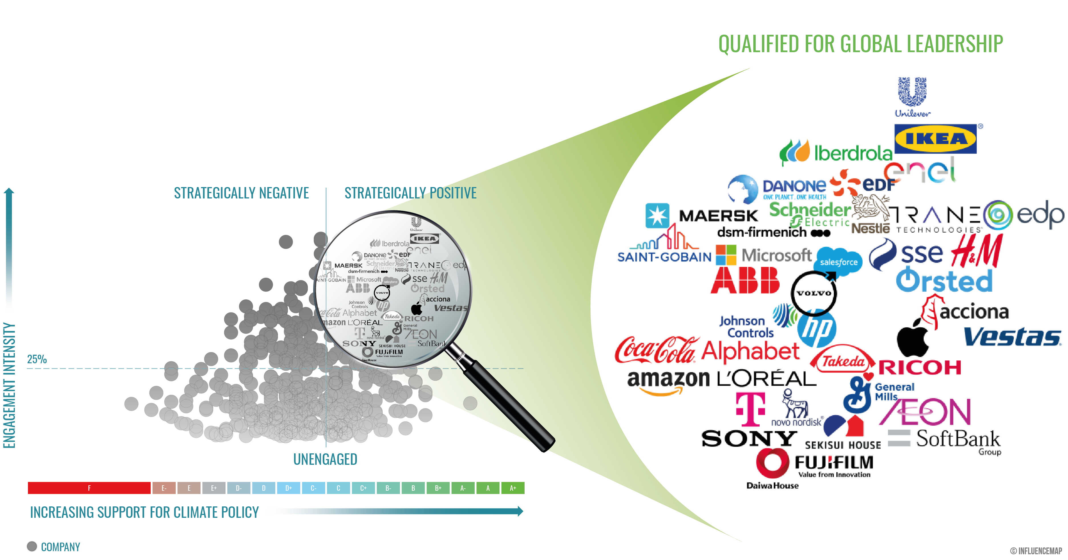 To be identified as a leader in any category, a company must have an Organization Score, Engagement Intensity, and Relationship Score above a certain threshold, indicating a strategic level of positive, direct advocacy on climate-related policy which is not fully offset by the indirect influence of its industry associations.